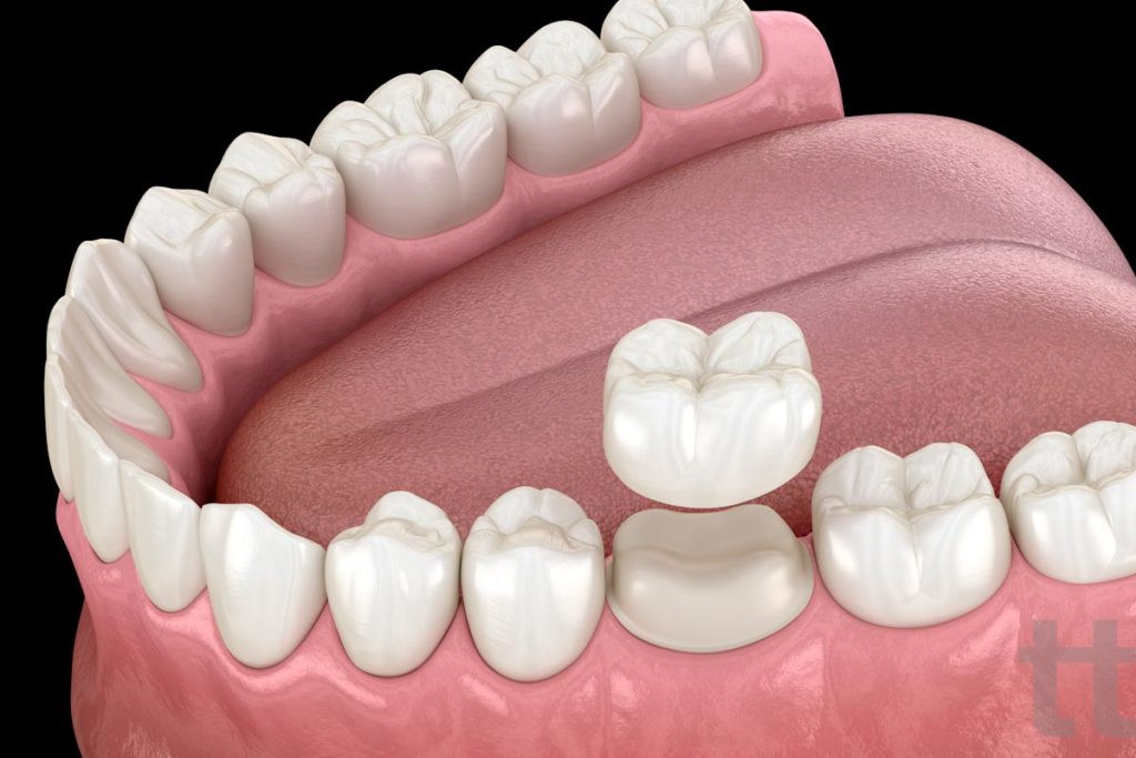 A dental crown is a tooth-shaped “cap” that is placed over a tooth. This cap covers the remains of the existing tooth to restore its shape, size and strength and improve its appearance. Crowns are cemented into place and fully encase the entire visible portion of a tooth that lies at and above the gum line.